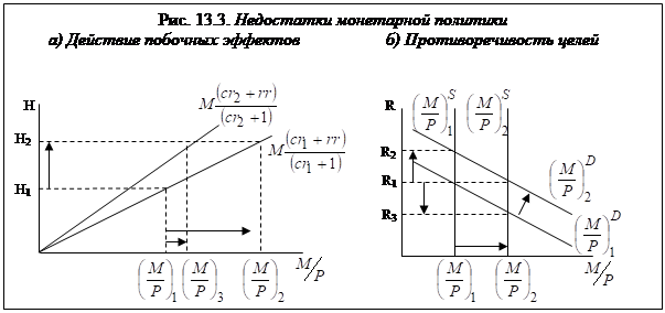 · Наличие побочных эффектов, вызываемых изменением предложения денег, которые также снижают эффективность монетарной политики. Так, если центральный банк увеличивает денежную массу, то ставка процента падает, т.е. снижаются альтернативные издержки хранения наличных денег. В этих условиях население может предпочесть перевести средства с депозитов в наличность, что уменьшит норму депонирования (коэффициент cr, равный отношению наличности к депозитам (cr = C/D)). Одновременно падение ставки процента (цены кредита) снижает заинтересованность коммерческих банков выдавать кредиты, увеличивая их избыточные резервы (excess reserves), что сказывается на величине нормы резервирования (коэффициента rr, равного отношению резервов к депозитам ( rr = R/D) и представляющего собой сумму нормы обязательных резервов (ur), устанавливаемой центральным банком, и нормы избыточных резервов (er), определяемой самими коммерческими банками (rr = ur + er)). Рост нормы депонирования и нормы резервирования ведет к снижению величины денежного мультипликатора, что существенно ослабляет эффект воздействия монетарного импульса на экономику (рис.13.3.(а)). Рост денежной базы от Н1 до Н2 может привести к росту денежной базы от М1 до М2, если не меняется величина мультипликатора, и лишь до М3, если происходит уменьшение величины денежного мультипликатора вследствие роста нормы депонирования (как в данном случае) и/или нормы