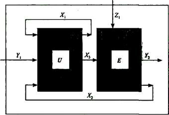 Структура этой модели содержит два элемента: элемент U — управляющий; элемент Е — исполнительный. Управляющий элемент воспринимает: через входной канал импульс из внешней среды (у);