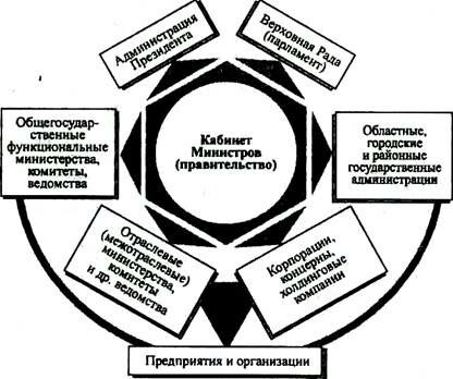 Кроме внутренних органов управления предприятиями и организациями, существуют высшие органы общегосударственного управления всеми субъектами хозяйствования. Формирование и функционирование таких органов управления является объективно необходимым и целесообразным ввиду потребности в таких управленческих решениях, принятие и практическая реализация которых находятся вне возможностей и компетенции предприятий и организаций. Действующая в Украине система общегосударственного управления показана на рис. 2.4.