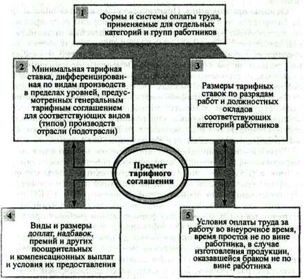 Тарифное соглашение — это договор между представителями сторон по вопросам оплаты труда и социальных гарантий. Она на каждом уровне имеет специфическую содержательную характеристику. В частности, предметом тарифного соглашения на производственном уровне (как составной части коллективного договора) являются структурные элементы, показанные на рис. 7.7.