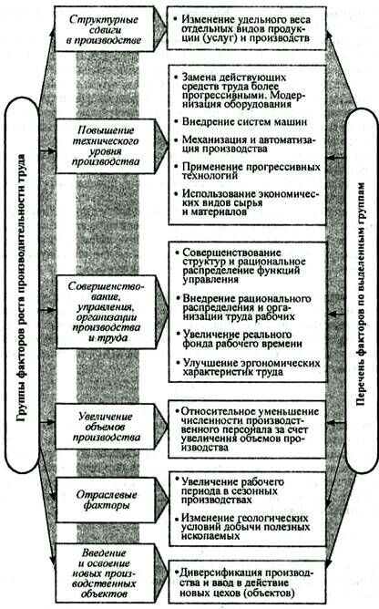 К группе внешних факторов относятся, те что объективно существуют вне контроля отдельного предприятия (т. е. факторы общегосударственные и общеэкономические — законодательство, политика и стратегия, рыночная инфраструктура; макроструктурные сдвиги в обществе; природные ресурсы).К внутренним — те, которые непосредственно влияют на уровень производительности труда (характер продукции, технология и оборудование, материалы, энергия; персонал, организация производства и труда, система мотивации и т. п.).