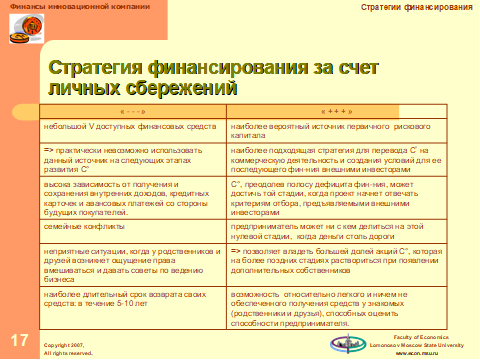 Этот способ финансирования является наиболее вероятным источником первичного рискового капитала - в развитых странах с его помощью стартует от 59 до 74% компаний. Понятно, что в России это цифра на уровне 85-95% [1], этот способ, с другой стороны, позволяет владеть и большей долей акций фирмы, которая на более поздних стадиях раствориться при появлении дополнительных собственников.