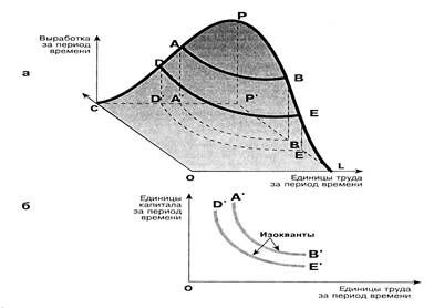 Соединим все точки поверхности производства соответствующие выработке АА¢ (АА¢ =ВВ¢) и получим контурную линию АВ, проекция которой на горизонтальную плоскость даст линию А¢ В¢. При выработке ДД¢ получим проекцию Д¢Е¢ . Этим линии называются изоквантами, которые представляют собой все комбинации ресурсов, позволяющие достичь данного объема выработки. Они показаны на рисунке.