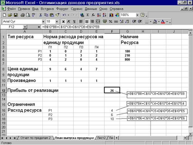 В ячейках F16, F17, F18 занесены формулы для расхода ресурсов.