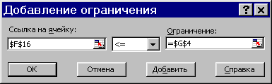 · Кнопка «Добавить» служит для отображения диалогового окна «Добавить ограничение», с помощью которого записываются выражения, определяющие ограничения.