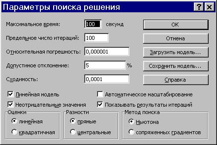 В этом окне можно изменять условия и варианты поиска решения для линейных и нелинейных задач, а также загружать и сохранять оптимизируемые модели. Значения и состояния элементов управления, используемые по умолчанию, подходят для решения большинства задач.