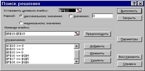 В результате заполнения всех полей и внесения всех ограничений, диалоговое окно «Поиск решения» для нашей задачи примет вид рис. 13.