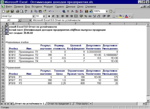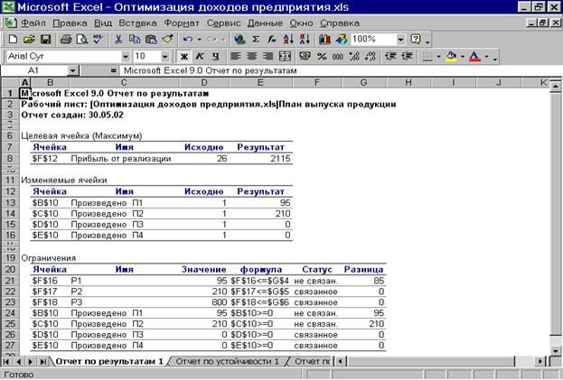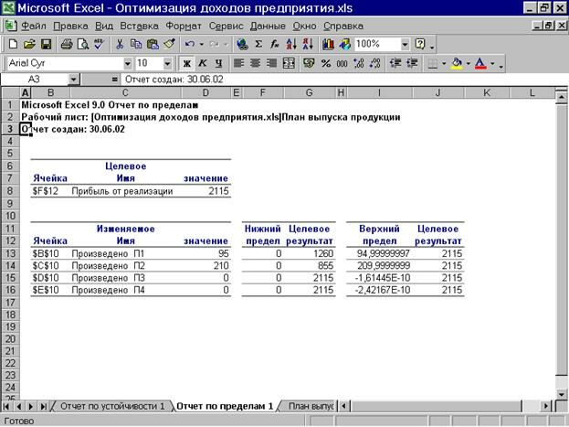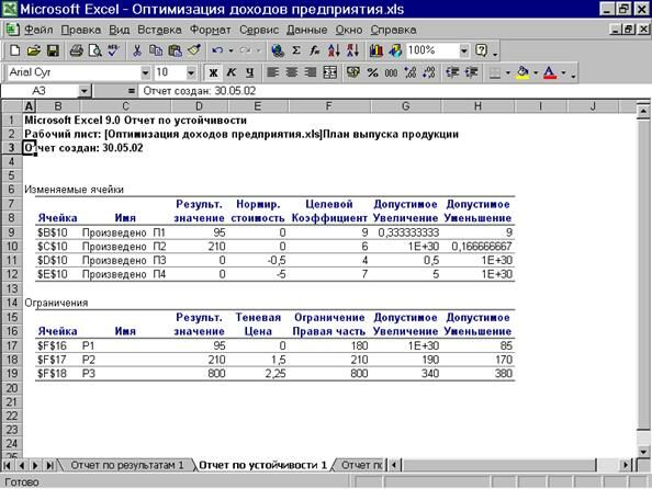 После нажатия кнопки «ОК» к книге добавляются по листу на каждый из выбранных типов отчета: «Отчет по результатам», «Отчет по устойчивости» и «Отчет по пределам».