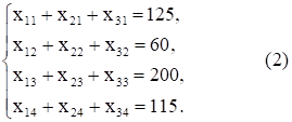 | Потребности bj | 125 | 60 | 200 | 115 |
