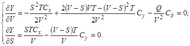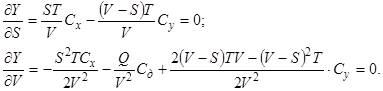 Чтобы определить минимум функции, находим частные производные от Y по S и V и приравняем их к нулю: