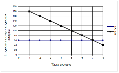 Оптимальное число посаженных деревьев определяется в точке пересечения функции предельных –выгод и предельных затрат (издержек). В данном случае оно равно семи деревьям.