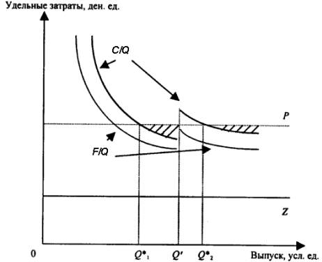 Таким образом, при увеличении выпуска полная удельная себестоимость должна быстро падать, на графике асимптотически приближаясь к прямой удельных переменных затрат. Однако поскольку ни одно предприятие не может безгранично увеличивать выпуск в силу технологических ограничений, при расширении производства кривые удельных расходов (постоянных и полных) выходят на новый уровень. Вид этих зависимостей приведен на рисунке 10.5. На нем так же, как и на рисунке 10.4, расширение производства происходит в момент, когда выпуск достиг уровня Q'. Очевидно, что удельная выручка (выручка за единицу продукции) равна цене этой единицы, т.е. Р.