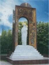 Этот памятный знак, посвященный 2000-летию Рождества Христова, называют в народе Луганской Богородицей. Скульптор, заслуженный художник Украины Е. Чумак и архитекторы А. Довгополов, А. Поздняков воплотили в созданном ими образе Царицы Небесной лучшие традиции православной церкви. Основой для памятника послужила икона Луганской Богородицы, которая находится в Свято-Петропавловском соборе города. В 1905г. Божия Мать явилась подвижнику христианства диакону Филиппу и предсказала, что Луганск станет городом Ее славы. Статуя Богородицы с Богомладенцем высечена из белого мрамора, специально доставленного с Караррского месторождения (Италия). Она стоит на плоскости слегка наклоненная вперед. Создается впечатление, что Божия Мать движется ― спускается с небес к людям. К Ней ведут шесть беломраморных ступеней. Ослепительно белую фигуру оттеняет арка, выполненная из облицовочного темно-красного гранита. На киоте вверху изображена Святая Троица, а по сторонам - 12 апостолов, учеников Христа. Фрески выполнены из цветной смальты. Венчает композицию золотой крест ― символ вечной жизни. Общая высота памятного знака ― 11,4 м. Он установлен на центральной улице города ― Советской.
