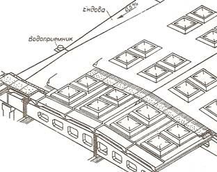 Шедовые фонари имеют вертикальное остекление и наклонное покрытие. Они хорошо изолируют помещение от прямых солнечных лучей, создают рассеянное, равномерное освещение, но сложны в устройстве и менее экономичны по сравнению с вышеприведенными фонарями (рис.1д).