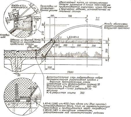 Зенитный фонарь состоит из стального стакана трапециевидного сечения, установленного над отверстием в покрытии, деревянной опорной рамы, заведенной в верхнюю часть стакана и светопроницаемого ограждения в виде двухслойных куполов или сводов. Теплоизоляция покрытия сохраняется герметизированной воздушной прослойкой, расположенной между оболочками из органического стекла.