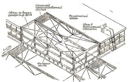 Пространственную жесткость фонарей обеспечивают горизонтальные связи по верху фонарей, воспринимающие продольные усилия от ветровой нагрузки и вертикальные связи между фонарными фермами, передающие усилия с горизонтальных связей на диск покрытия по стропильным фермам. Связи устанавливают в средних и крайних шагах температурного блока. Их подразделяют на: