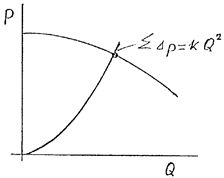 Из формулы 6.1 следует, что для вентиляторов характеристика сети представляет собой квадратичную параболу. Если наложить на неё характеристику вентилятора, то точка пересечения графиков характеристики сети и характеристики вентилятора по давлению (она обычно называется рабочей точкой) определяет параметры режима работы вентилятора на данную сеть (рис. 6.2).