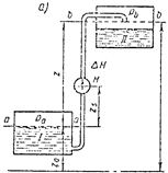 По иному определяется характеристика сети для работающего на неё насоса. Если применить уравнение Бернулли (2.4) для установки, схема которой показана на рис. 6.3 и предположить, что, как это чаще всего бывает на практике, PI=PII=Pа, то напор, который необходимо создать насосу, будет составлять H=Hг+DH, т.е. напор насоса идёт не только на преодоление гидравлических потерь (DH), но и на подъём жидкости на высоту Hг. Поскольку гидравлические потери, как и ранее, пропорциональны Q2, характеристика сети для насосной установки будет иметь вид:
