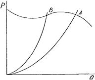 Если постоянный режим соответствует точке А (рис. 6.5), то в случае увеличения подачи давление нагнетателя уменьшается, а сопротивление сети возростает. Это вызовет торможение потока и возвращение режима в точку А. Здесь тангенс угла наклона характеристики сети больше тангенса угла наклона характеристики нагнетателя. Такая система является устойчивой.