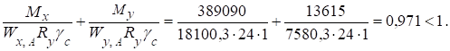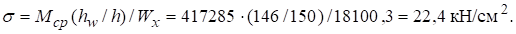 где σx = (Мx/Wx,А)hw /hб = (389090 / 18100,3) 146 / 150 = 20,92 кН/см2;