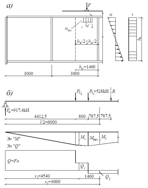 а – распределение напряжений в стенке; б – схема загружения балки и