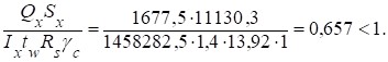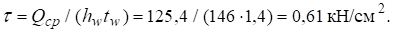 τ = QMSf /(Ix,ntw) = 347,72 ∙ 6719,2 / (1357524,1 ∙ 1,4) = 1,23 кН/см2 –