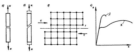 а - отрыв; б - срез; в - схема смещения атомных слоев при сдвиге; г - диаграмма работы материала; 1 – плоское скольжение; 2 – вязкое разрушение; 3 – хрупкое разрушение
