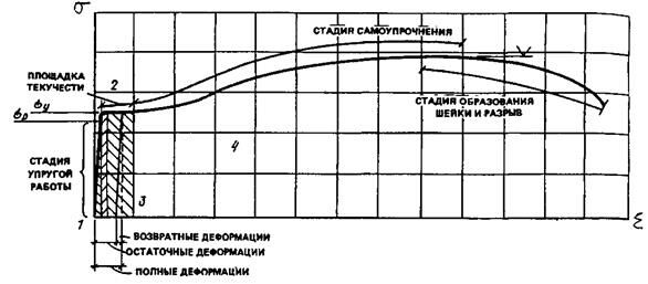 Работу стали при одноосном напряжении можно проследить по испытанию образца на растяжения (рис.1.4.).