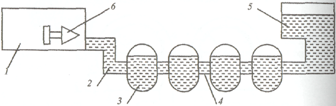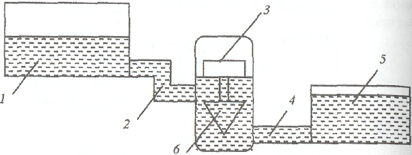 | Рис. 1.6.10. Схема ГАЭС: 1 - верхний бассейн; 2 - напорный тоннель; 3 - машинный зал; 4 - отводящий тоннель; 5 - нижний бассейн; 6 - насос-генератор |