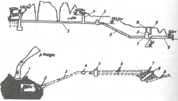 | Рис. 1.6.4. Компоновка камер и выработок подземной Ингури ГЭС: 1 - верхний бьеф; 2 - водозабор; 3 - напорный водовод (деривационный тоннель); 4 - уравнительная шахта; 5 - камера затворов; 6, 7 - турбинные водоводы; 8 - машинный зал с турбинами; 9 - водоотводящий тоннель нижнего бьефа |