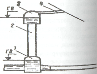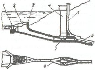 | Рис. 1.6.5. Схема водозабора: 1 - шандорное ограждение; 2 - решетка; 3 - раструб; 4 - строительный ствол; 5 - воздухопровод дли предотвращения образования вакуума и воздушных пробок; 6 - напорный тоннель; 7 - затворы; 8 - рукава | Рис. 1.6.6. Схема уравнительной камеры: 1 - нижняя камера; 2 - ствол; 3 – верхняя камера; 4 - штольня |