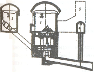| Рис. 1.6.9. Компоновка машинного зала подземной ГЭС: 1 - машинный чал: 2 - камера затвора; 3 - напорный водовод; 4 - камера затворов отводящего водовода; 5 - монтажный ствол |