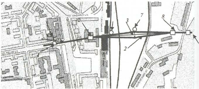 | Рис. 1.4.10. Плановая и высотная трассировки тоннеля уменьшенного габарита, г. Екатеринбург 1÷8 - основные горнотехнические объекты |