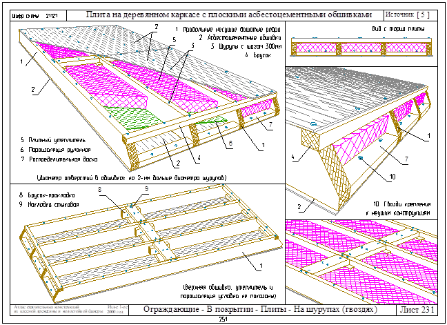 Панели с деревянным каркасом и плоскими асбестоцементными обшивками имеют такую же конструкцию и размеры, как и клеефанерные панели. Их применяют в холодных и утепленных покрытиях и помещениях с асбестоцементной и рулонной кровлей, потолок которых должен быть несгораемым.