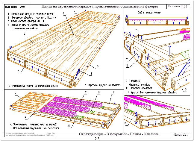 Каркас панелей состоит из продольных и поперечных досок-ребер, которые могут быть цельными или клееными. Продольные рабочие ребра, сплошные по длине, ставятся на расстоянии не более 50 см друг от друга. Поперечные ребра жесткости ставятся на расстоянии не более 1,5 м, как правило, в местах расположения стыков фанеры, и прерываются в местах пересечения с продольными ребрами. Обшивки панелей состоят из листов фанеры повышенной водостойкости марки ФСФ, толщиной не менее 8 мм, состыкованных по длине «на ус». Обшивки склеиваются  с каркасом таким образом, чтобы направление наружных волокон фанеры совпадало с направлением древесины продольных ребер для того, чтобы фанера работала в направлении своей большей прочности и жесткости. Клеефанерные панели выполняют функции настила, прогонов, водо- и пароизоляции. Они характеризуются малой массой при значительной несущей способности, имеют большую жесткость в своей плоскости. Поверхности панелей, обращенные внутрь помещения, покрывают огнезащитными составами для повышения их степени огнестойкости.