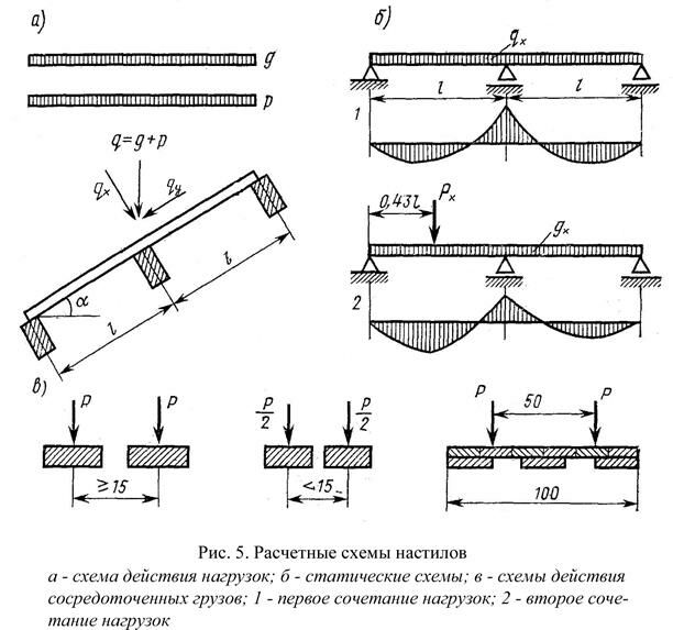 Расчет дощатых настилов производят по прочности и прогибам при изгибе на действие расчетных и нормативных нагрузок: