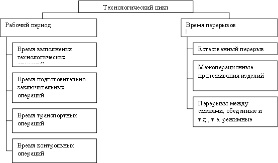 Технологический цикл – важнейшая составляющая процесса производства продукции. Его можно охарактеризовать как календарный период времени в течение которого предмет труда проходит все стадии обработки, начиная с запуска изделий производства (с 1-ой технологической операции) и заканчивая сдачей готовой продукции на склад.