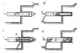 2. При продавливании часть грунта попадает в трубу, а остальная часть грунта уплотняется. В этом случае конец трубы открыт или на него надевается наконечник с отверстием (рис., в). В процессе продвижения трубы грунт удаляется из нее с помощью специальных желонок и других устройств.