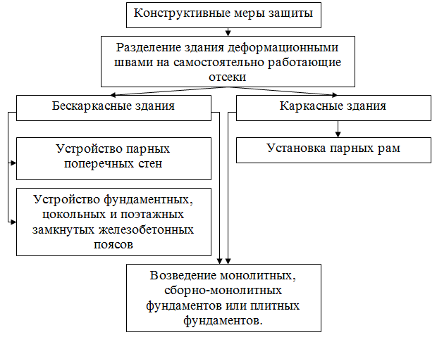 Основной конструктивной мерой защиты здания от влияния горных выработок является их разделение деформационными швами на самостоятельно работающие отсеки. В бескаркасных жилых зданиях устанавливают парные поперечные стены, в каркасных – парные рамы.