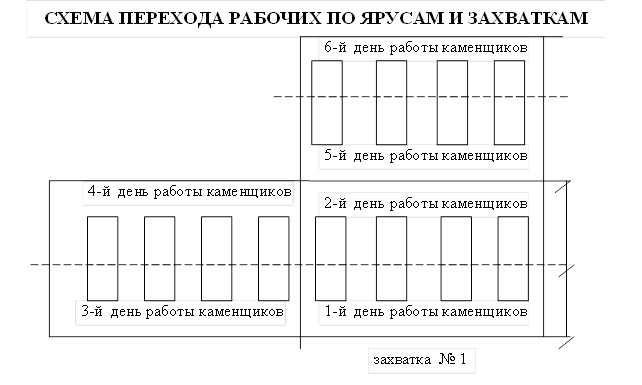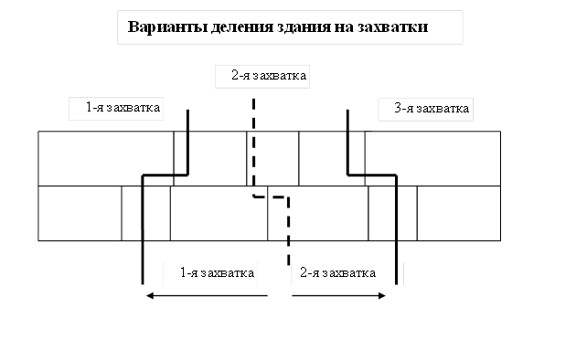 Для организации поточного строительства, позволяющего рационально использовать необходимые ресурсы, здания в плане и по высоте, в пределах одного этажа, разбивают на захватки и ярусы. В том случае, когда здание в плане разделено на 2 захватки, можно совместить во времени работу каменщиков и монтажников, которые будут работать одновременно каждый на своей захватке. Каменщики выкладывают каменные стены на одной захватке на всю высоту этажа и только после этого переходят на следующую захватку. Подготовленный таким образом фронт работ будет занят монтажниками.