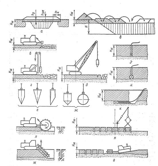 в, г, д - рыхление мерзлого грунта механическим способом;