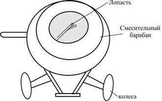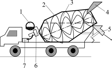 1 – бак для воды; 2 – барабан, 3 – лопасти, 4, 5 – разгрузочные устройства; 6,7 – приводы смесительного барабана