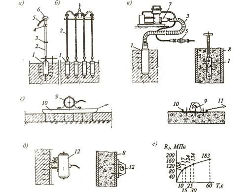 а – глубинный вибратор (вибробулава); б – вибропакет; в – вибратор с гибким валом; г — поверхностный вибратор; д – наружный вибратор; е – график нарастания прочности бетона (уплотнение в течение 10... 60 с); 1 – цилиндрический рабочий корпус; 2 – металлическая штанга; 3 – резинотканевый шланг; 4 – выключатель; 5 – питающий кабель (с разъемом); 6 – рукоятка; 7 – электро­двигатель; 8 – опалубка; 9 – поверхностный вибратор; 10 – рабочая площадка вибратора (плита-поддон); 11 – гибкая тяга для перестановки поверхностного вибратора; 12 – наружный вибратор