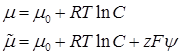 В условиях равновесия, электрохимические потенциалы двух растворов равны: