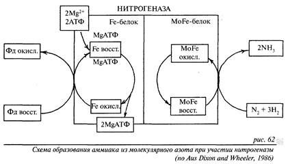 Конечным продуктом фиксации азота является аммиак. В процессе восстановления азота до аммиака участвует мультиферментный комплекс - нитрогеназа. Нитрогеназа состоит из двух компонентов: MoFe-белок и Fe-белок. MoFe-белок содержит молибден, железо и серу и осуществляет связывание и восстановление азота. Fe-белок содержит железо и серу, участвует в транспорте электронов от их доноров (ферредоксин) на MoFe-белок.