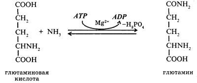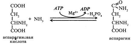 Глутаминовая и аспарагиновая кислоты, присоединяя еще одну молекулу аммиака, дают амиды – глутамин и аспарагин. В реакциях образования амидов необходима энергия АТФ и присутствие ионом магния, для активации сентетаз.