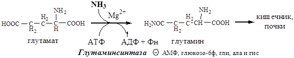 - Высокие концентрации аммиака, при участии глутаминсинтетазы, стимулируют синтез глутамина из глутамата в нервной ткани: