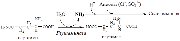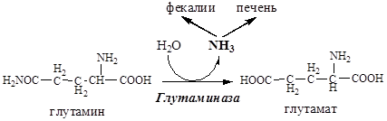 В клетках кишечника также под действием глутаминазы происходит гидролитическое освобождение амидного азота в виде аммиака: