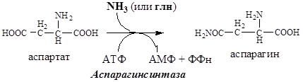 Обезвреживание аммиака в тканях происходит незначительно при синтезе аспарагина под действием глутаминзависимой и аммиакзависимой аспарагинсинтетазы.