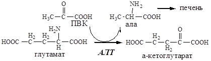 Глутамат подвергается трансаминированию с ПВК с образованием аланина и α-кетоглутарата. Аланин поступает из кишечника в кровь воротной вены и поглощается печенью.